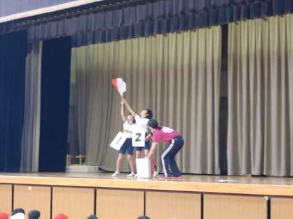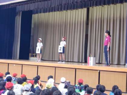 今朝の体育朝会では、運動会の赤白決めが行われました。