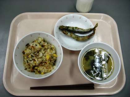 そぼろごはん ししゃもの磯辺揚げ みそ汁 牛乳