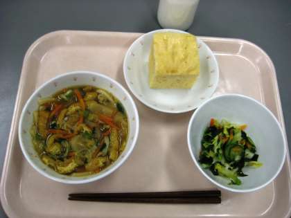カレーうどん 野菜の甘酢かけ チーズ入り蒸しパン 牛乳
