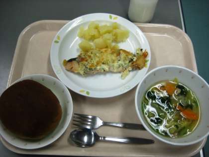 あしたばパン 魚のマヨネーズ焼き 粉ふきいも 野菜スープ 牛乳