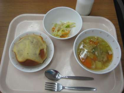 ビスキュイパン 白いんげん豆の田舎風スープ たまねぎドレッシングサラダ 牛乳