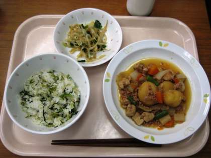 青菜とじゃこのごはん 新じゃがのそぼろ煮 もやしのごま風味 牛乳