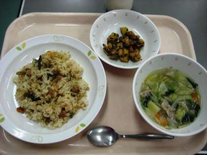 山菜ピラフ ベーコンと野菜のスープ お豆かりんとう 牛乳