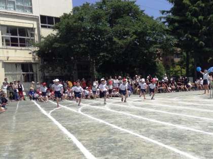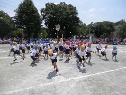 1年生は、午前の部に「たたかえかいぞくだん」(玉入れ)と、午後の部でかけっこをやりました。入学してわずか2ヶ月でしたが、1日とてもよくがんばりました。