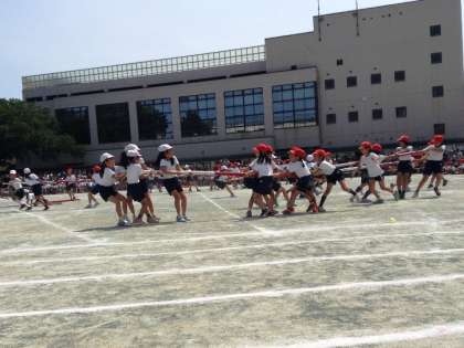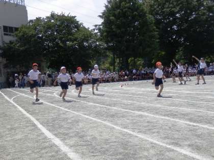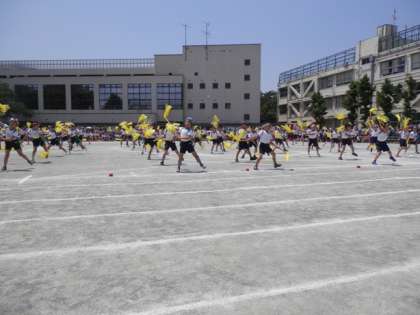 低学年から中学年になり、かけっこが80m走になり、カーブを走りました。演技は「ロック☆音頭 八木節」、団体競技は「ダッシュdeゲット」(棒引き)3種目もやりました。