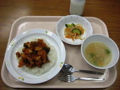 ガーリックライスなすミート ABCマカロニスープ ごまドレッシングサラダ 牛乳