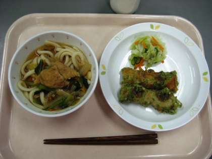 きつねうどん ちくわの磯辺揚げ 野菜の甘酢かけ 牛乳