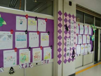 各学級の代表1名の「心に残った1冊」の紹介ポスターが掲示されています。