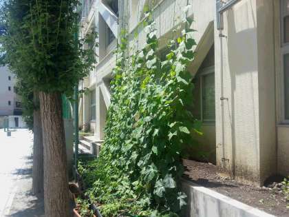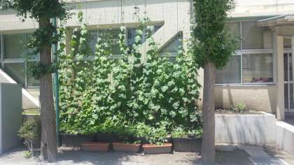 職員室とひまわりの窓には、ゴーヤやへちまといった弦が伸びる植物があります。これからどんどん成長しカーテンのようになります。