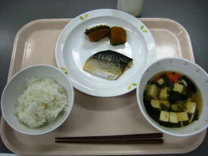 ごはん さばの塩焼き かぼちゃの含め煮 すまし汁 牛乳