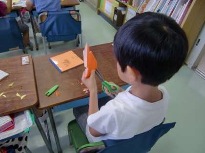 1年生の図工では、折り紙を折って切って楽しいかざりを作っています。
