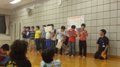 二日目夜のイベントは子ども会です。芦花小、祖師谷小、烏山小の友だちと楽しい時間を過ごしました。最後は各学校の6年生が河口湖の思い出と中学校に向けての決意を発表しました。