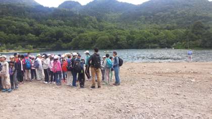 これからハイキングに出発です。まず、湯ノ湖を半周し湯滝に向かいます。