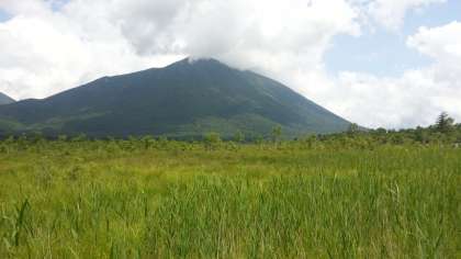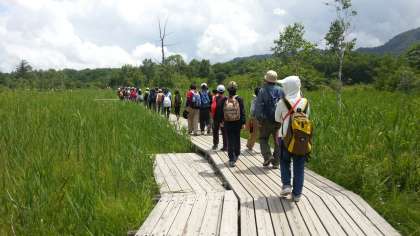 戦場ヶ原の広い湿原の中を歩きました。正面には男体山が見えます。