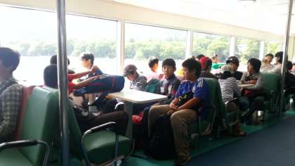 ハイキングの最後は船に乗りました。湖の風も心地よいです。
