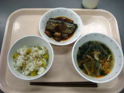 さつまいもごはん さんまのしょうが煮 沢煮椀 牛乳