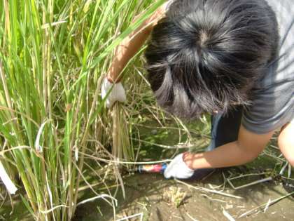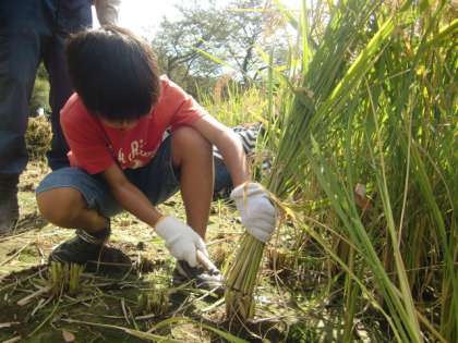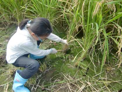 青空のもと、次太夫堀公園で五年生が稲刈りをしてきました。5月に自分たちで植えた苗を一生懸命刈りました。たくさん収穫できました。