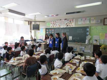 6年生・1年生・5年生の勉強の様子を見学した後、2年生と一緒に給食を食べました。英語も少しだけ話してみました。
