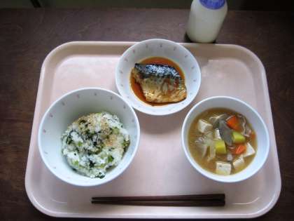 菜めし さばのしょうが風味焼き さつま汁 牛乳