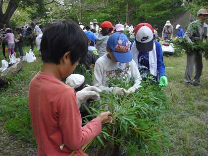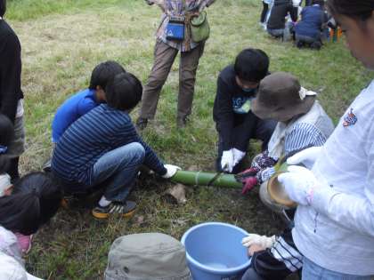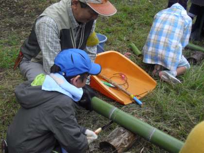 本日、里山コア会議の方々のご協力のもと、四年生が竹細工体験を行いました。里山にある竹を使って、それぞれ思い思いの一輪挿しをつくっていました。
