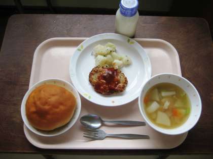 丸パン アップルチーズハンバーグ パセリポテト かぶのスープ 牛乳