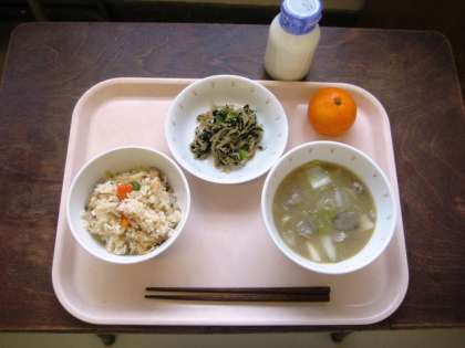 とりめし とびうおのつみれ汁 ほうれん草のいそ和え みかん 牛乳