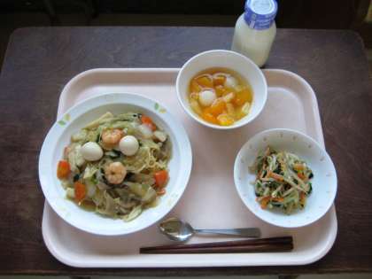 五目あんかけそば ナムル フルーツ白玉 牛乳