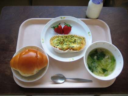バターロールパン フレンチエッグ 野菜スープ いちご 牛乳