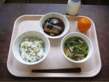 菜めし さんまの松前煮 沢煮椀 ぽんかん 牛乳