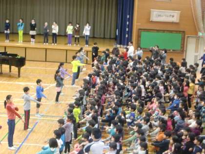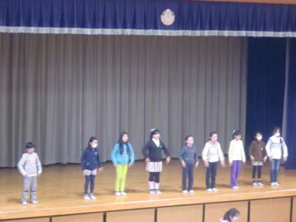 4年生が代表者が全校児童の前でお手本を示し、みんなでチャレンジしました。