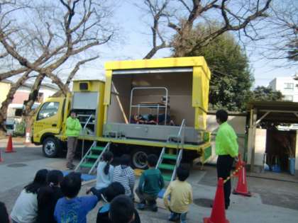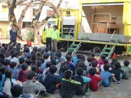 避難訓練が終わった後、4年生は起震車体験がありました。