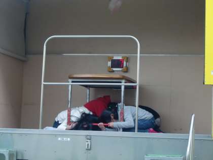 揺れが大きくなると、机の脚を掴んでいることも難しくなります。