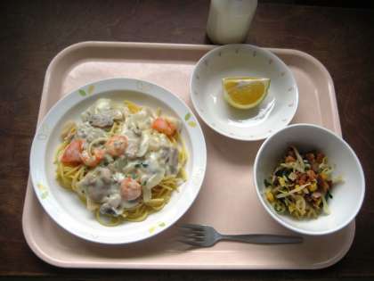 スパゲティクリームソース ほうれん草サラダ はるか 牛乳
