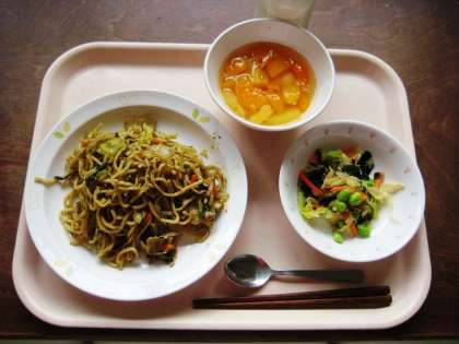 ソースやきそば かむかむ海藻サラダ フルーツ白玉 牛乳