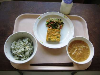 じゃこと青のりのごはん 千草焼き 野菜のごまだれかけ みそ汁 牛乳
