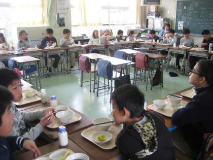 たてわり班にわかれて、1〜6年生までいっしょに給食を食べたり、