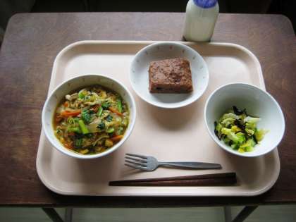 カレーうどん きゃべつの塩こんぶかけ おからケーキ 牛乳