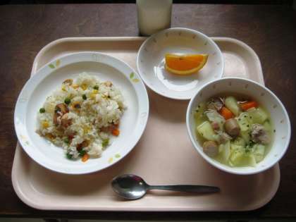 鮭ピラフ ポトフ ネーブルオレンジ 牛乳