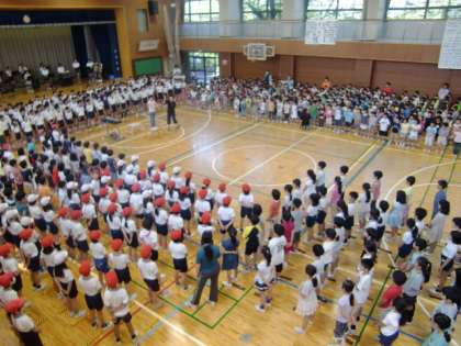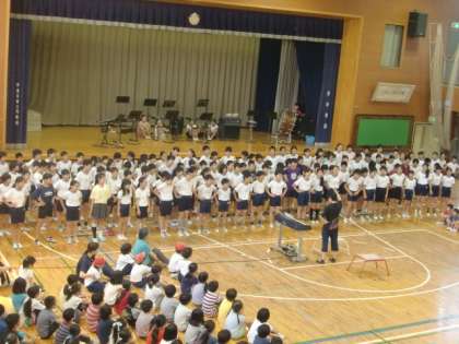 6年生が「つばさをください」の合唱をして、その後に運動会の歌を全校児童で歌いました。