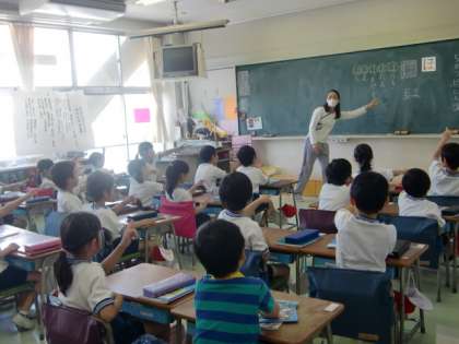 1年生はひらがなの練習をしています。今日は「ほ」の字を担任の先生と空書きしていました。
