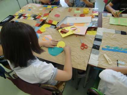 3年生は図工の時間に「マイクッションを作ろう」という授業で、紙を様々な形に切ったり貼ったりして、個性あふれるマイクッションを作っていました。