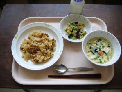 キムチチャーハン かむかむ海藻サラダ ニラ玉スープ 牛乳