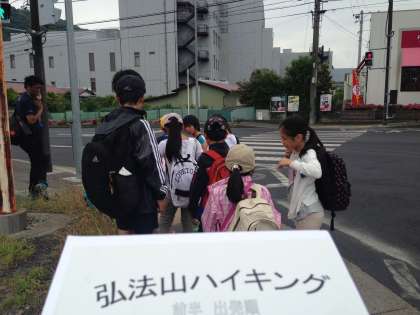 オリエンテーリングで、班ごとにクイズに答えながら歩いています。