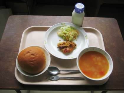 丸パン タンドリーチキン キャベツサラダ ツナのミネストローネ 牛乳