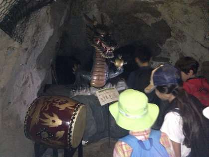 岩屋の中を班ごとに巡りました。太鼓を2回たたいて、龍が光ると願い事がかなうそうです。