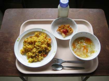 カレーピラフ 大豆とコーンのフリッター きゃべつスープ 牛乳