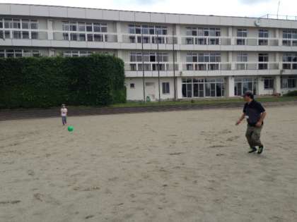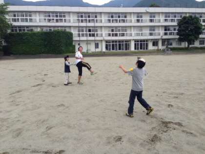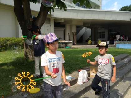おやつの牛乳を飲んだあと、外でシャボン玉を作ったり、フリスビーやボールで遊んだりしました。