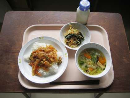 スタミナ丼 わかめサラダ 中華スープ 牛乳