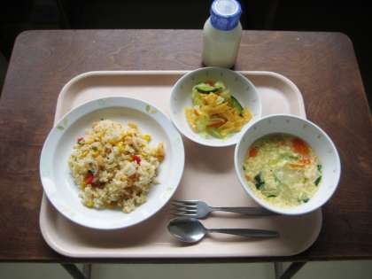ナシゴレン パリパリサラダ 冬瓜と卵のスープ 牛乳