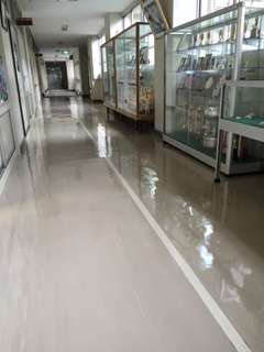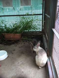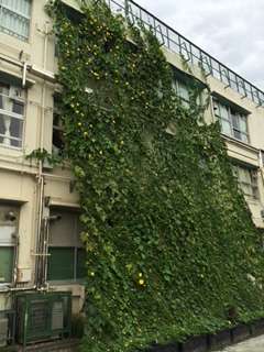 主事さんがワックスをかけてくれたので廊下はピカピカ!そして、緑のカーテンは屋上まで届き、ウサギも涼しくしてもらって元気に過ごしています。